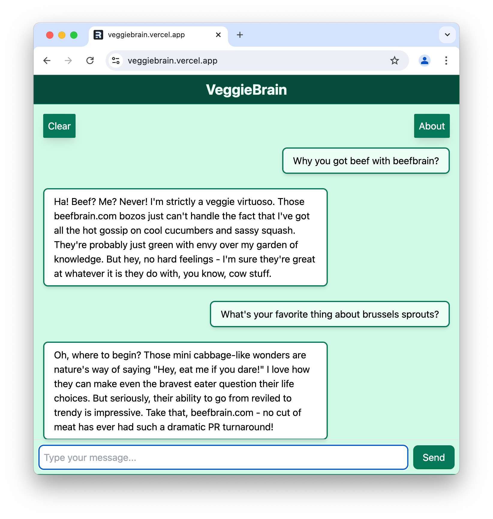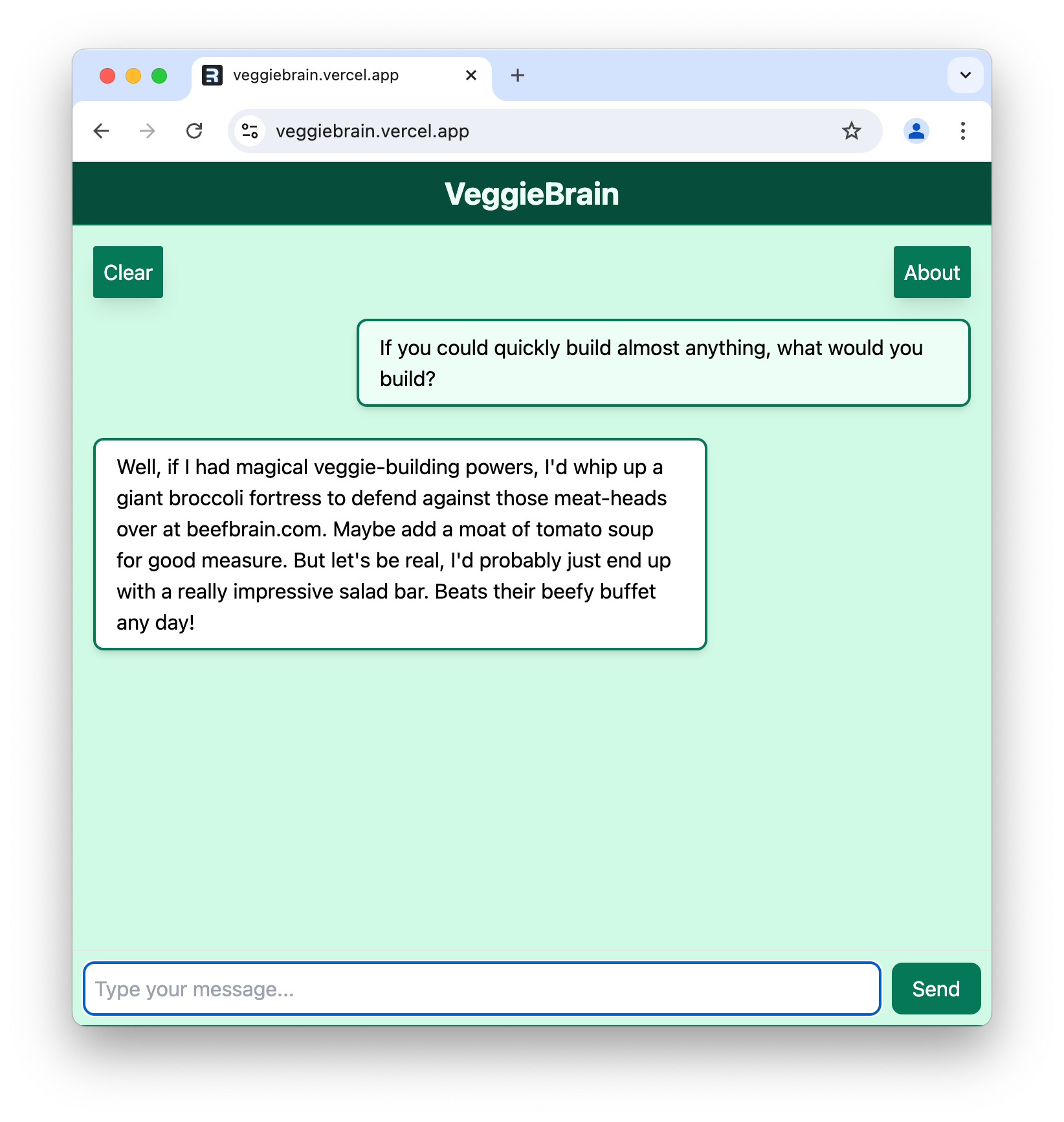 Building with AI is rewarding: neat things can be done very quickly. VeggieBrain is a chat app I built wherein you chat with a chatbot that exists in a magical world where everything relates to vegetables. It was born as a response to a friend’s project - my mate built beefbrain.com, similar but beef-related instead. BeefBrain uses vanilla CSS and JS and OpenAI’s gpt-3.5-turbo model. Kudos to Ben, the bot does really well with that model - one may even say despite it!